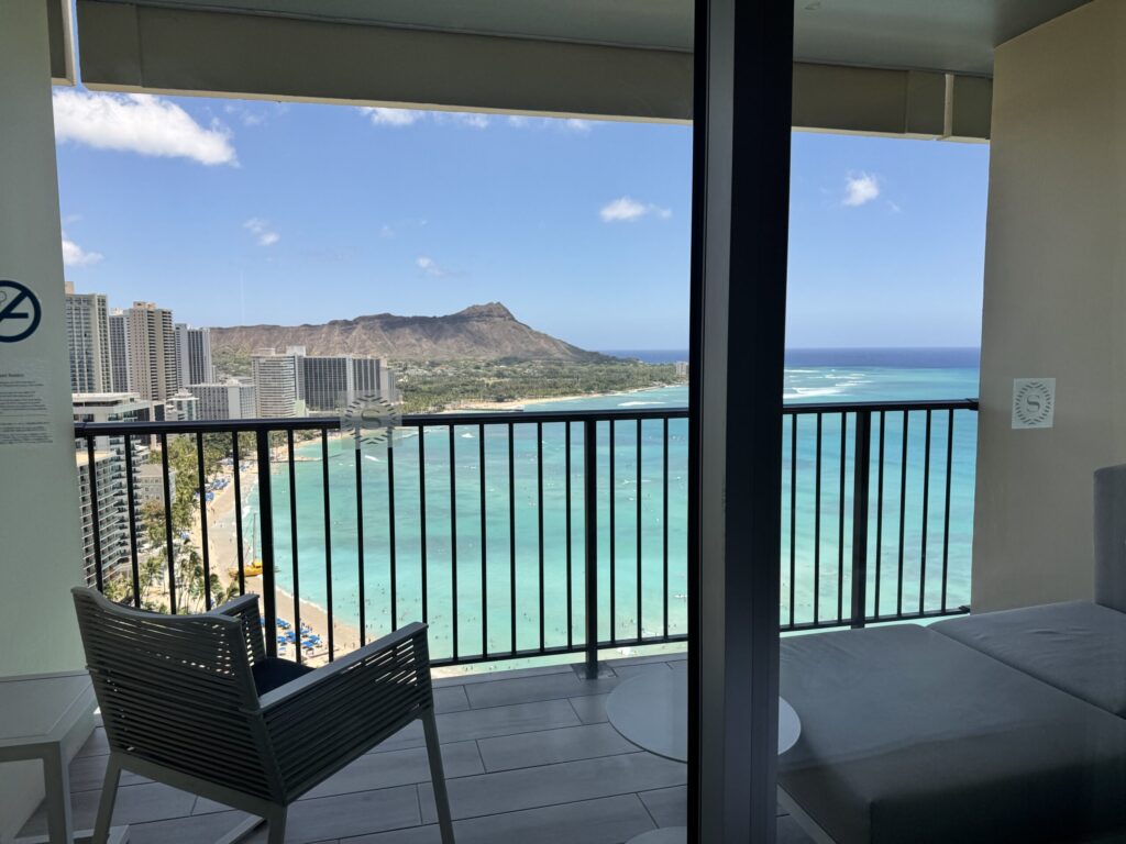 今回、Marriott Bonvoy® アメリカン・エキスプレス®・プレミアム・カードを持っていたことで、チェックイン時に部屋をアップグレードしてもらえました。高層階のゾートのダイヤモンドヘッドオーシャンフロントという部屋に通され、窓いっぱいに広がる景色に思わず声が出るほど感動しました。